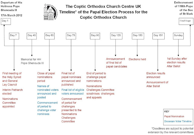Out of respect for the memory of our departed father His Holiness Pope Shenouda III and the feelings of the Church in general, the Holy Synod unanimously decided that it would not make or receive nominations until the forty-day memorial period for His Holiness was concluded on 26 April 2012. This period has now come to an end, and nominations are being received by the Nominations Committee.